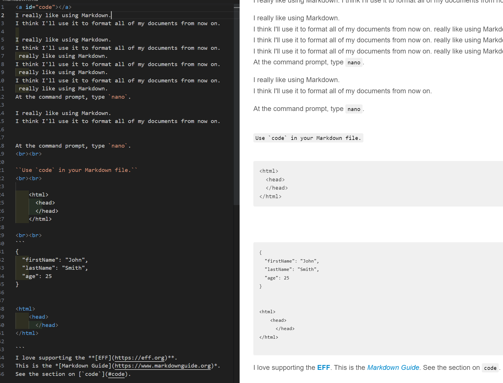 | ``Use `code` in your Markdown file.`` | <code>Use `code` in your Markdown file.</code> | Use `code` in your Markdown file. |