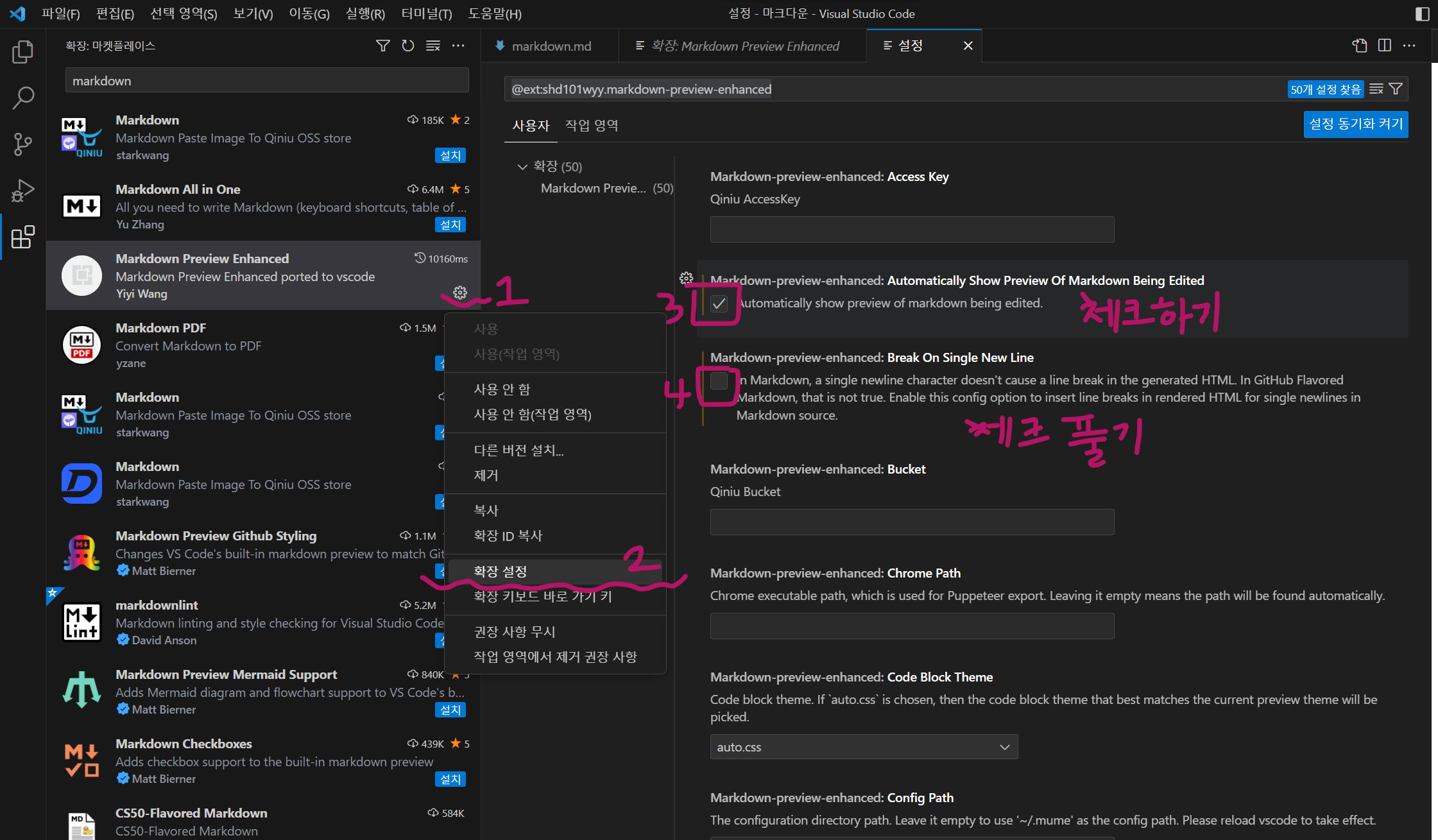 3번을 체크하게 되면 마크다운파일 켜지면 자동으로 프리뷰가 켜지게 할거냐~ 묻는거임. 체크를 한다!