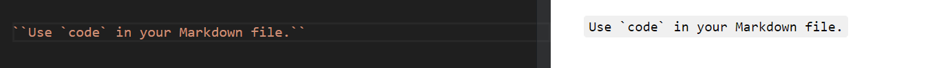``Use `code` in your Markdown file.`` | <code>Use `code` in your Markdown file.</code> | Use `code` in your Markdown file. |