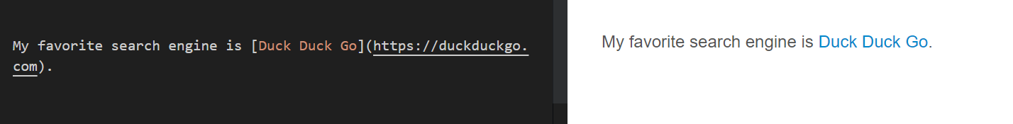 글자에 링크를 만들려면 링크 텍스트를 대괄호(예: [Duck Duck Go])로 묶은 다음 바로 뒤에 URL을 괄호(예: (https://duckduckgo.com))로 묶습니다.