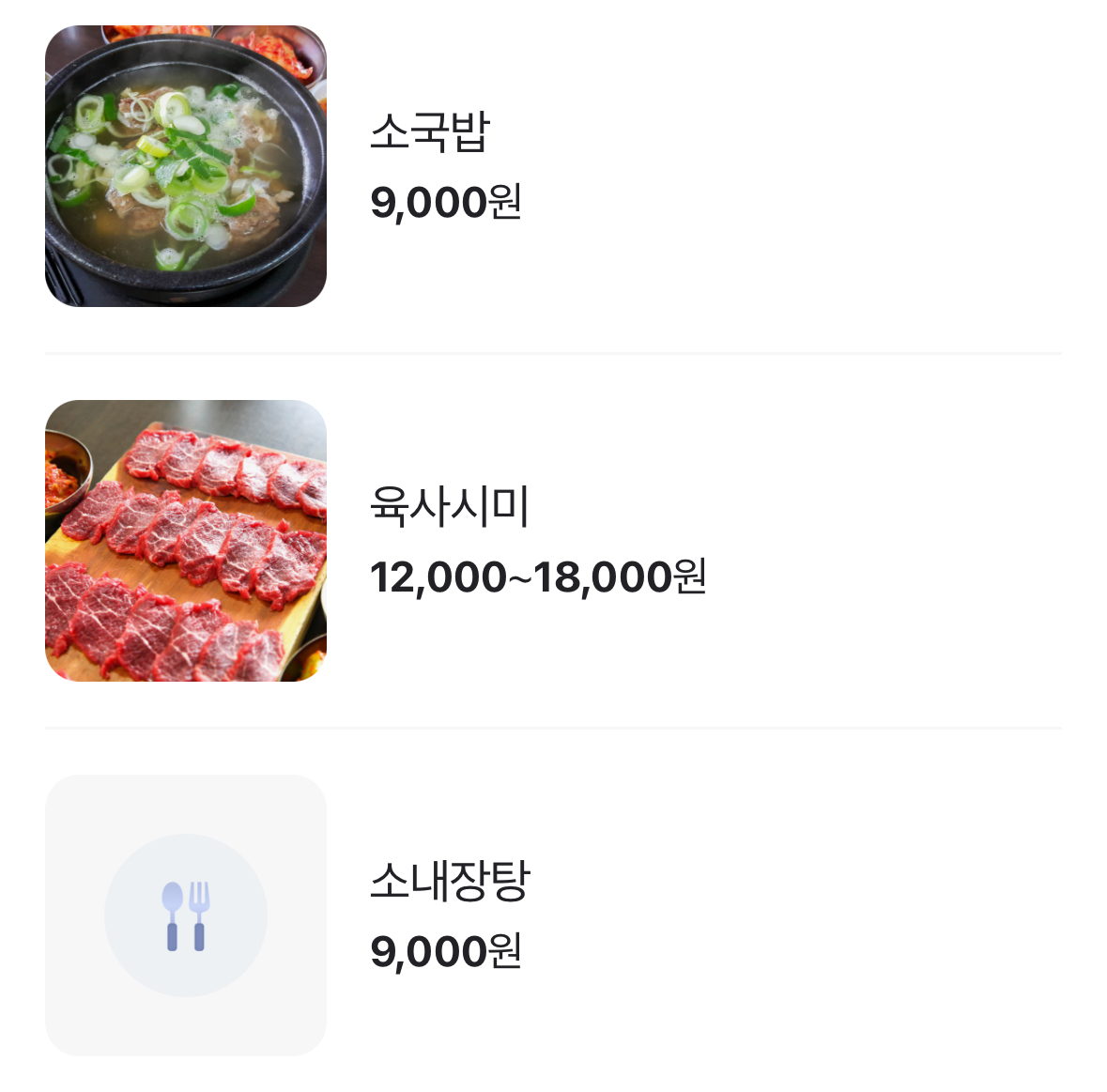 소국밥 육사시미 소내장탕이 인기 음식입니다.